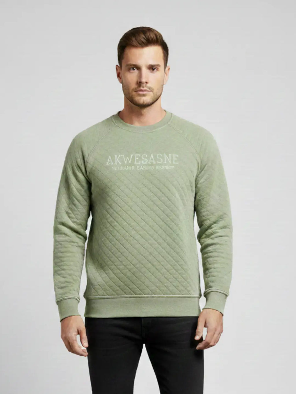 This men’s quilted Akwesasne sweatshirt features a textured diamond pattern with a soft, comfortable feel. Designed with raglan sleeves and ribbed cuffs for a relaxed fit, it’s ideal for everyday wear. The front graphic adds a casual, stylish touch suitable for any wardrobe.